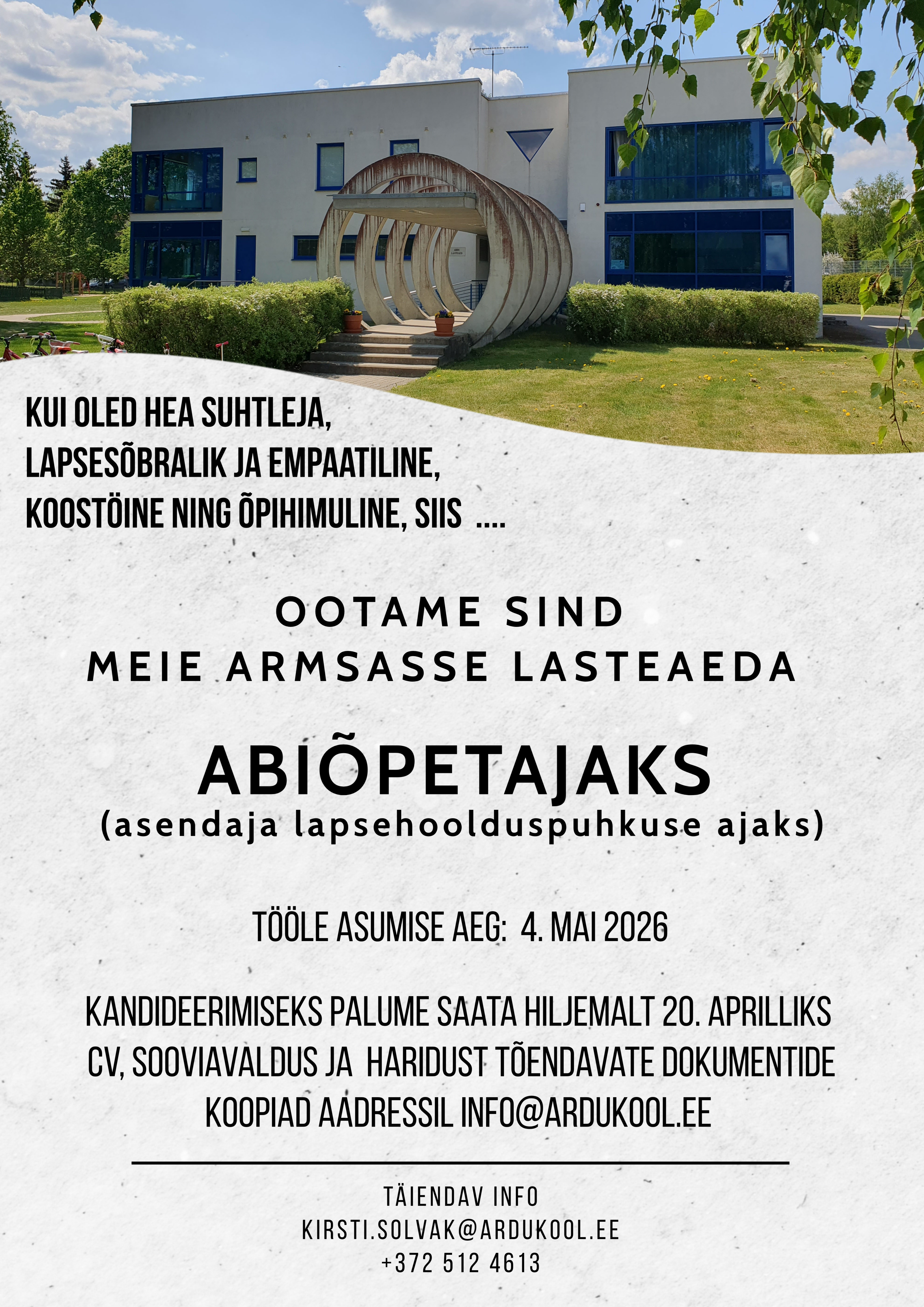 Otsime oma meeskonda abiõpetajat, et asendada lapsehoolduspuhkusel viibivat töötajat.